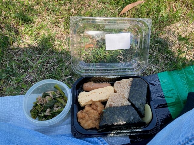 サンプラザで買った「鶏ごぼう飯のおにぎりセット」(海苔だけ自分で巻きました😊)と、あと野菜が欲しかったので、菜の花とツナの炒め物を作ってきました☝🏻
