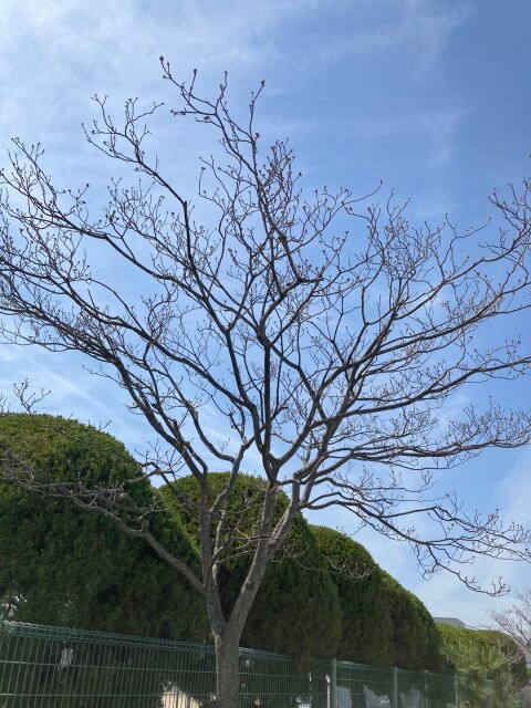 お弁当を買って外に出ると、お店の向かい側にあった桜の木、全く花が咲いていません😅