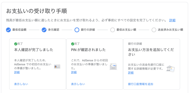 「おめでとうございます!」のポップアップ画面を閉じると、いつもの「推定収益額」の上に、「お支払いの受け取り手順」という画面ができていました🙂
