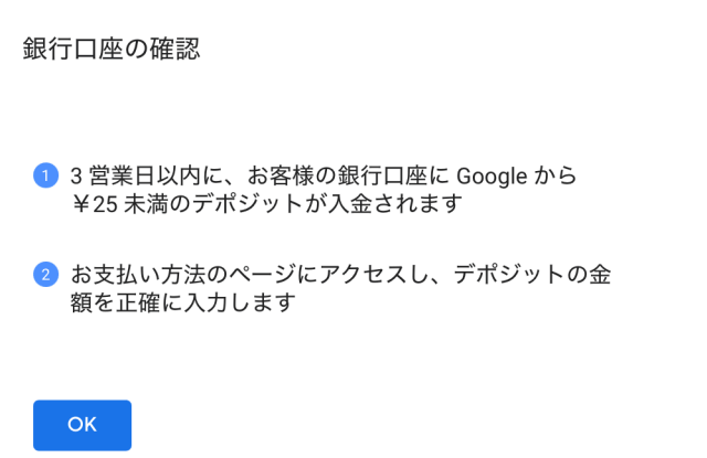 右下の「銀行の詳細」をクリックして、口座情報を入力、3営業日以内に少額の振り込みがあるので、その金額を入力して口座確認の完了です👌🏻