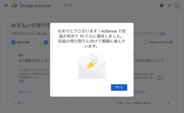 昨年末、アドセンスのホーム画面を開くと、突然「おめでとうございます!」と、ポップアップ画面が飛び出してきました😳