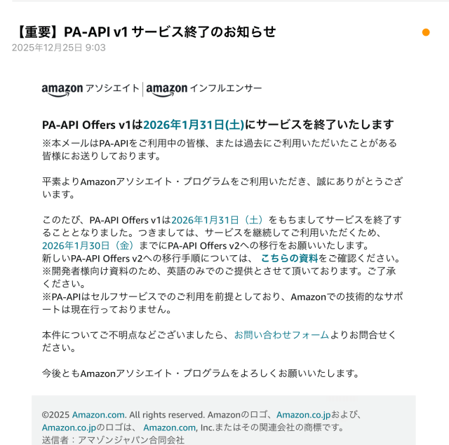 「2026年1月30日(金)までにPA-API Offers v2への移行をお願いいたします。」
